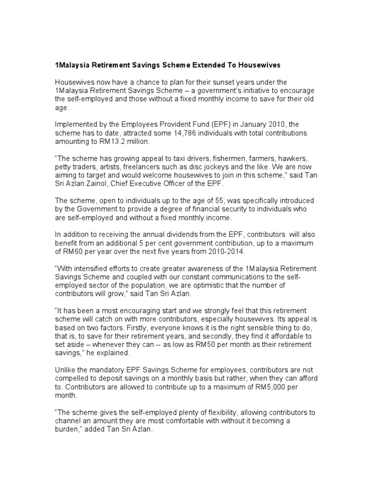 1malaysia Retirement Savings Scheme Extended To Housewives Labour Economies Free 30 Day Trial Scribd
