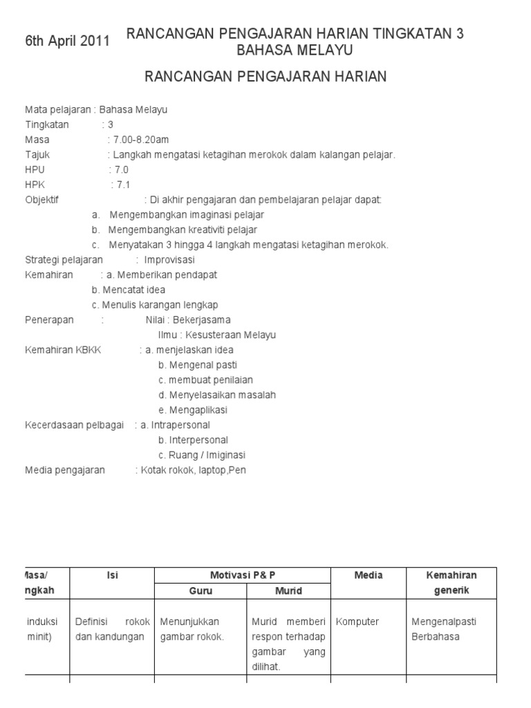 Rancangan Pengajaran Harian Tingkatan 3 Bahasa Melayu Kesusasteraan Melayu Jiwa Kita