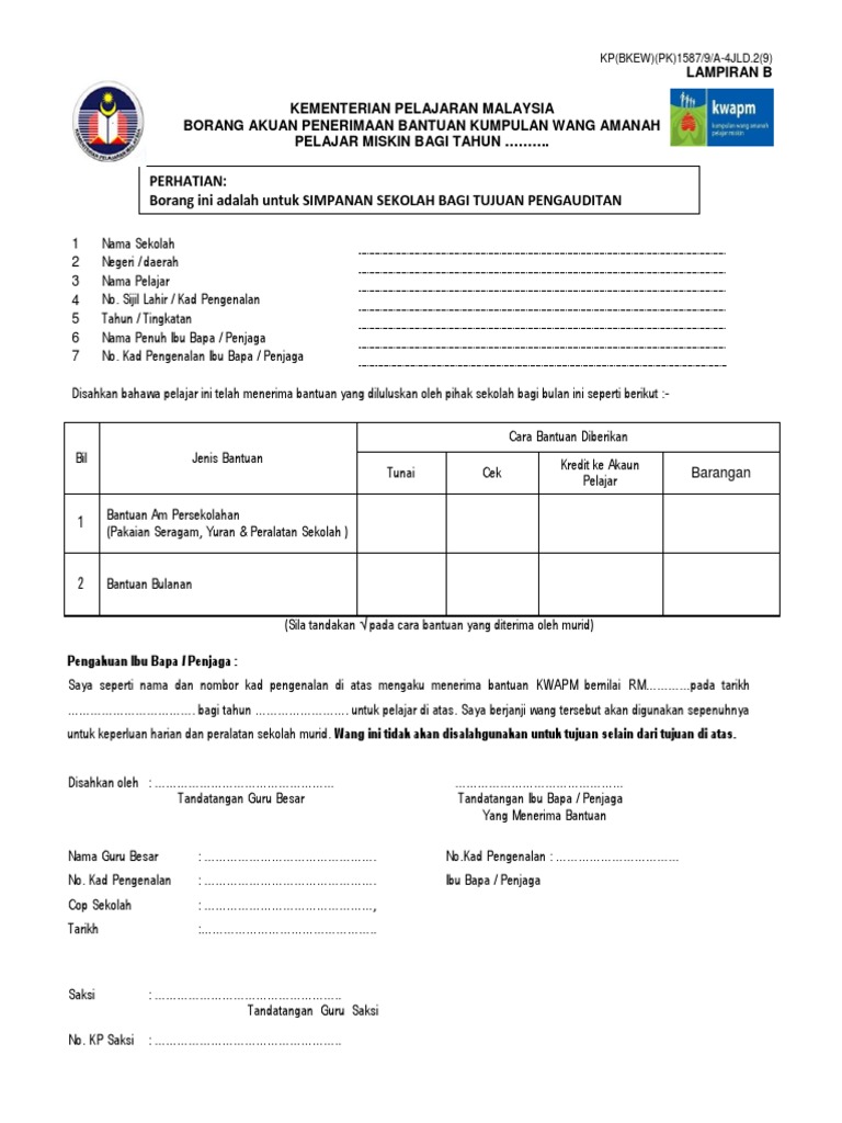 Lampiran B Borang Akuan Penerimaan Bantuan Kwapm