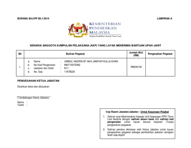 Borang Buj Upah Jahit Baju