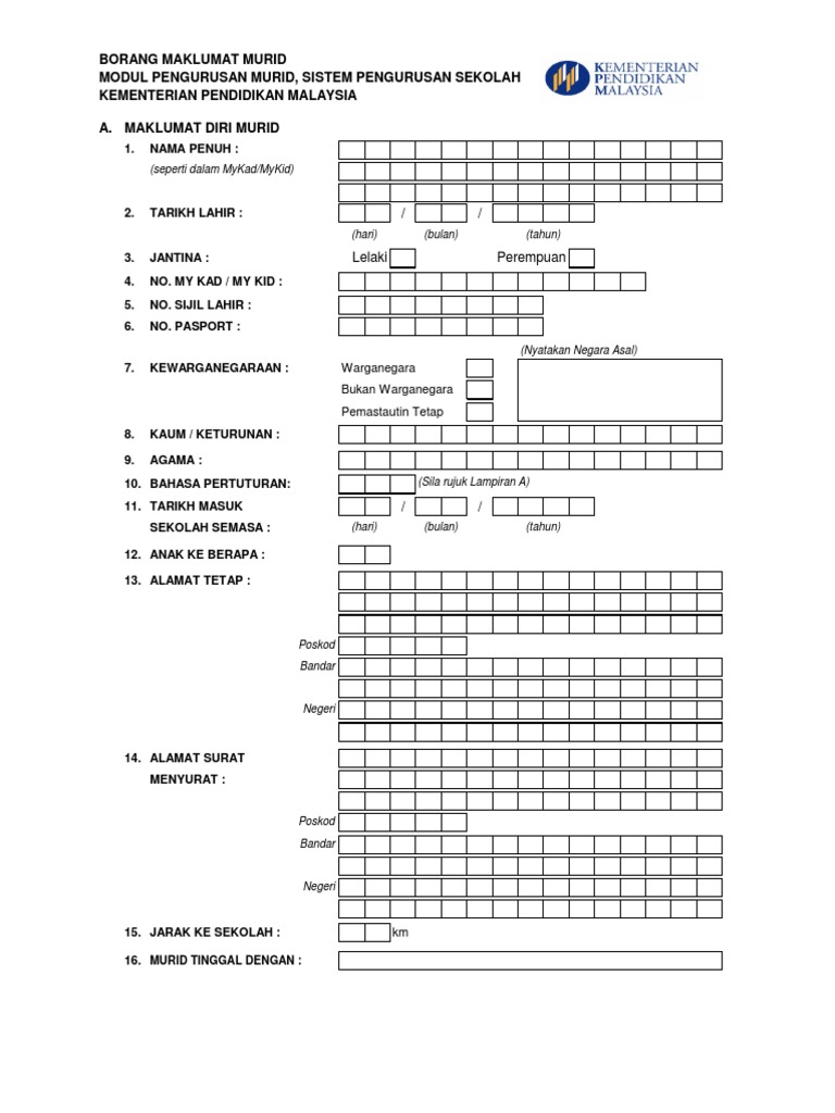 Borang Maklumat Murid Modul Pengurusan Maklumat Diri Murid 1 Sistem Pengurusan Sekolah Kementerian Pendidikan Malaysia Hari Bulan Berkeperluan Khas Ya Tidak