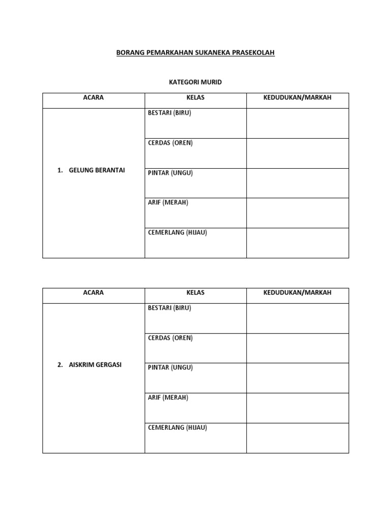Borang Pemarkahan Sukaneka Prasekolah