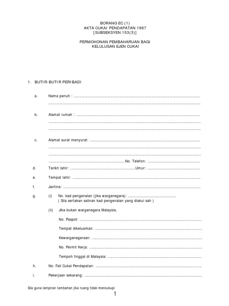 Borang Ec 1 Akta Cukai Pendapatan 1967 Subseksyen 153 3 Permohonan Pembaharuan Bagi Kelulusan Ejen Cukai